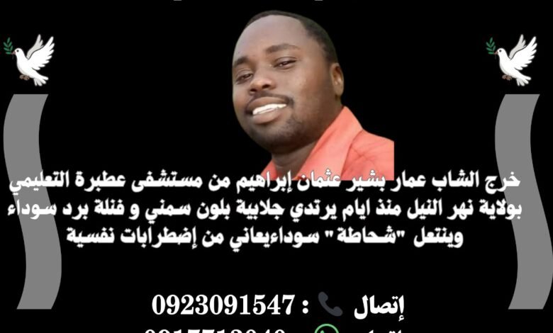أبلغت أسرة الشاب عمار بشير عثمان إبراهيم عن فقدانه منذ عدة أيام عقب خروجه من مستشفى عطبرة التعليمي بولاية نهر النيل، حيث كان يتلقى العلاج من اضطرابات نفسية.